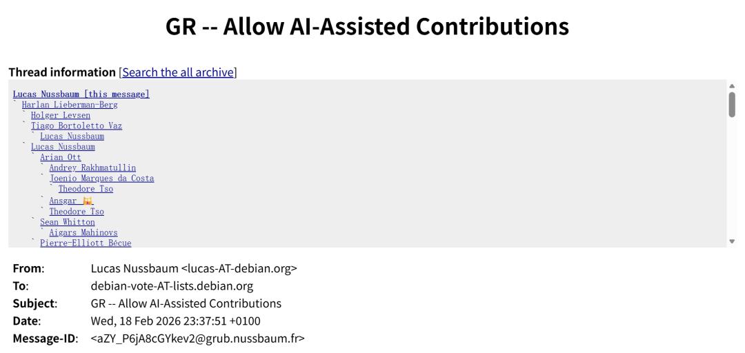 他建议 Debian 社区讨论一个问题:是否允许 AI 生成或 AI 辅助生成的代码进入 Debian 项目。为此,他提出了一份草案,希望明确 Debian 在这一问题上的政策,并表示会先收集几天社区反馈,再决定是否正式提交决议。