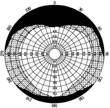 高德曼视野图谱。中间的白色部分对应“双眼能一起看到的视野”,带纹理部分对应“一只眼睛能看到但另一只看不到的周边区域”。图源:1964 NASA report, Bioastronautics Data Book。