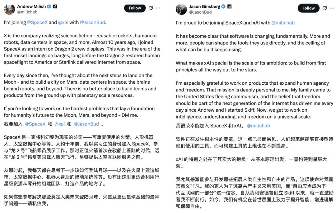官宣推文上,Milich 和 Ginsberg 解释了各自加入 SpaceX 和 xAI 的原因。