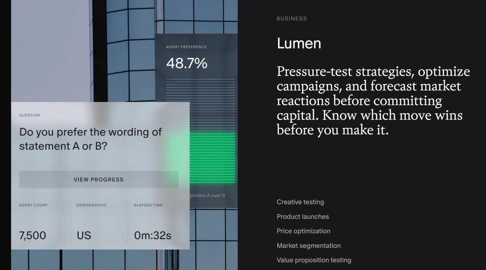 其中,Lumen专用于市场调查,可以完成创意测试、产品发布、价格优化、市场细分、价值主张测试、流失预测、营销策略、竞争定位、品牌认知跟踪等任务。