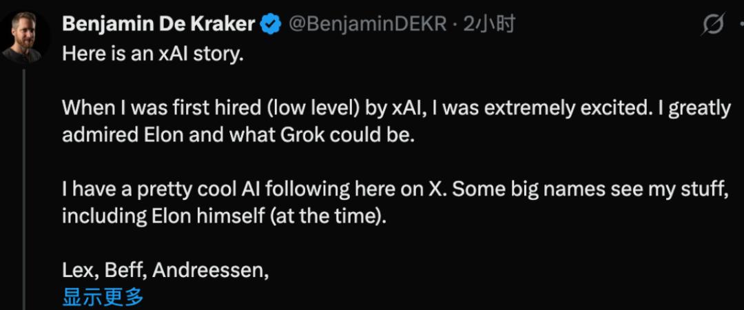 Kraker称自己入职时级别不高,但对xAI充满热情。他在X上拥有一批颇具影响力的AI领域关注者,包括Lex Fridman、Marc Andreessen等科技圈知名人物,马斯克本人当时也在其中。