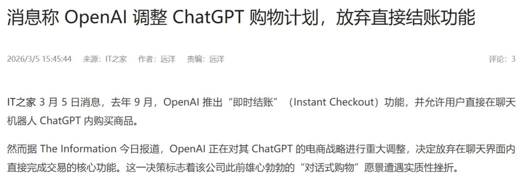 但你有没有想过,OpenAI这波认怂,其实不是AI购物这事不行,是OpenAI这个搞法不行。