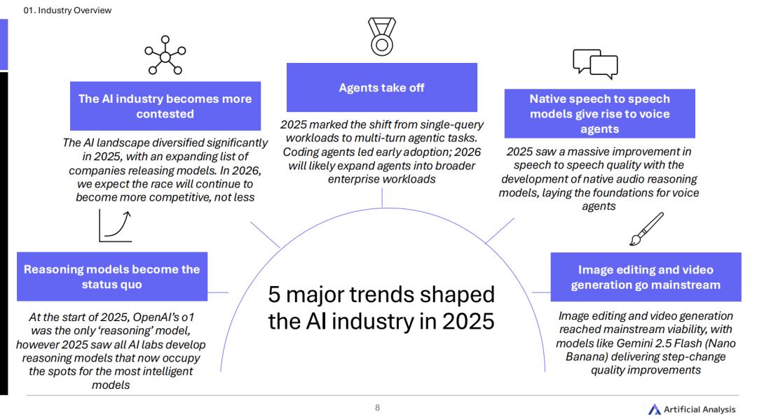 Artificial Analysis的这份报告认为,2025年,5大核心趋势彻底重塑了整个AI行业的骨架: