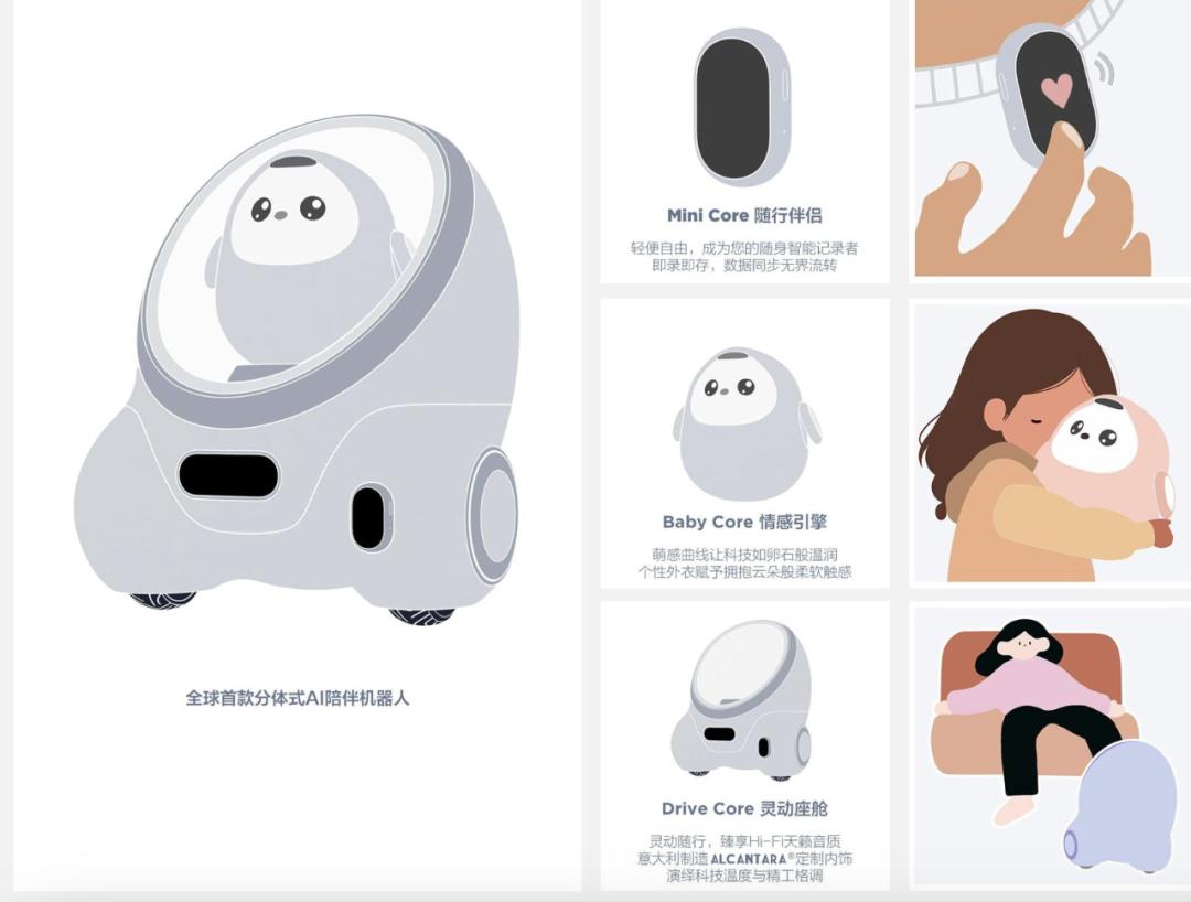 AiMe和其他陪伴机器人最大的区别是分体式设计,由三个部分组成:一个可以随身佩戴的交互设备(Mini Core随行伴侣)、机器人上半身、充电仓。