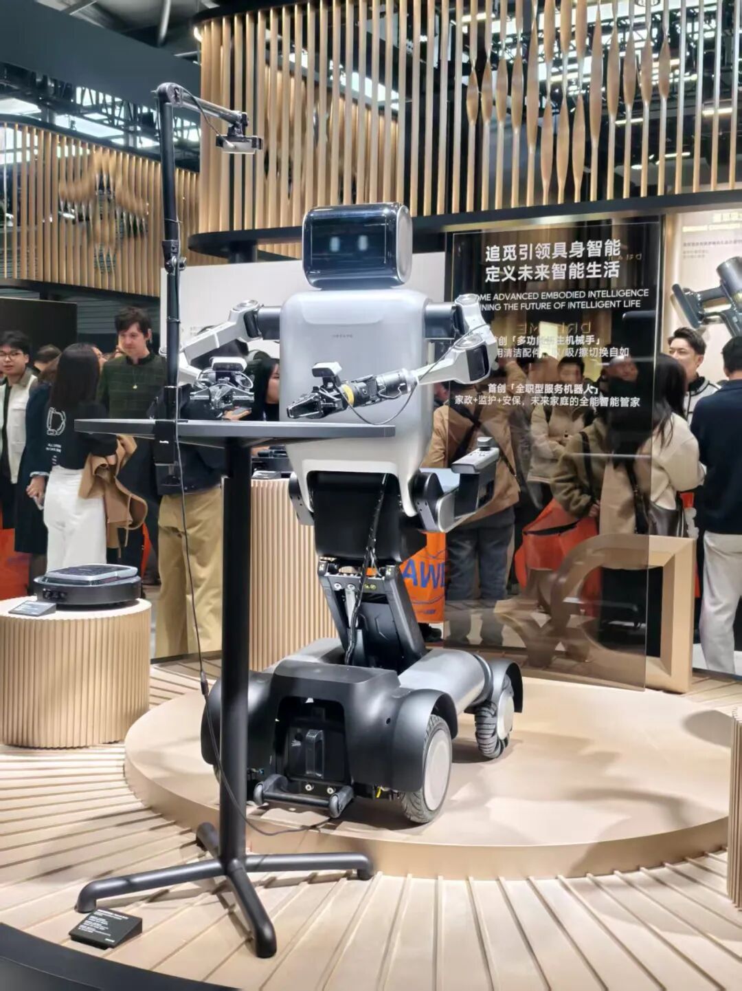 追觅还展出了一台“轮椅机器人”。现场工作人员对我们说,依靠四个轮,这台机器人可以从卧室开到阳台,稳定又快捷,家里的老人还可以把它当做轮椅。