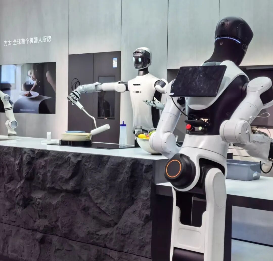 手,负责执行,由不同类型的机器人组成——人形机器人负责拟人化动作,比如倒油、下盐、热锅、颠勺;高精度机械臂则负责精细化的操作,如杯具定位、接水、餐具规整等。