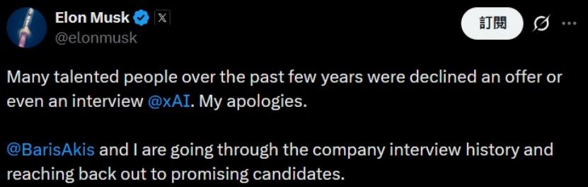 马斯克本人的反应是,在社交媒体上表示很抱歉:过去xAI没有给行业内人才足够多的邀请和面试机会,现在正在跟人力部门负责人一起重新翻拣过去的面试记录,看能否找出遗珠。