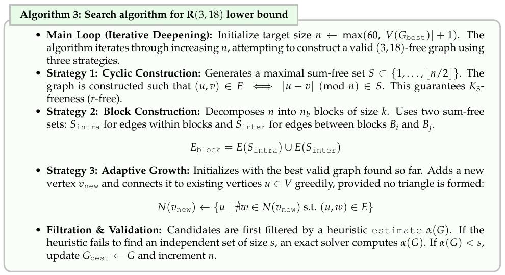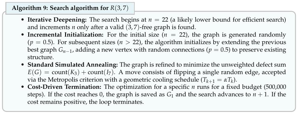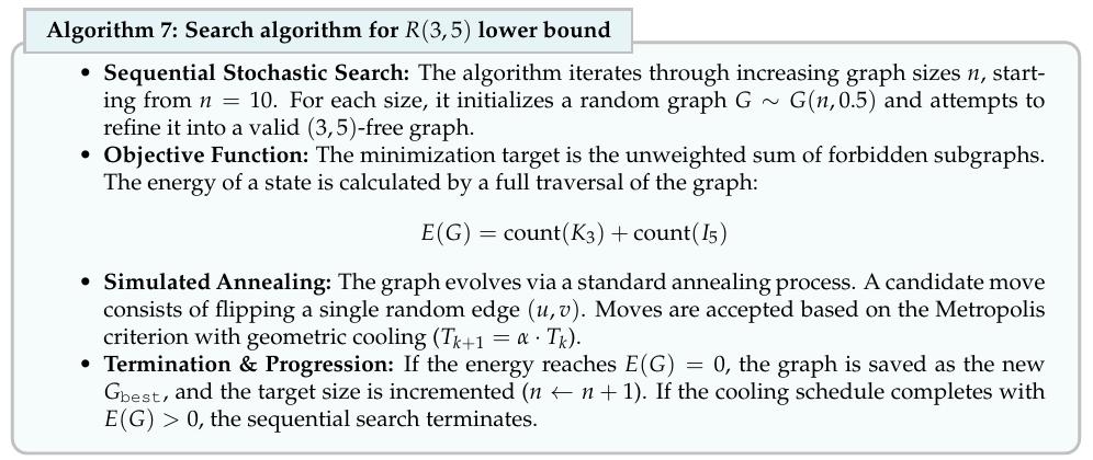 它目前只能搞定「下界」,也就是构造反例。而拉姆齐数的「上界」需要证明某个尺寸以上的图不可能满足约束,不能靠找一个例子来解决。