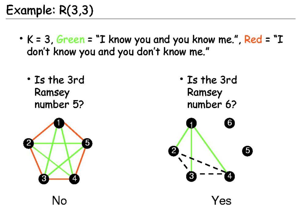 这样就意味着,任意6个顶点的图,必然包含一个三角形,或三个互不相连的点。