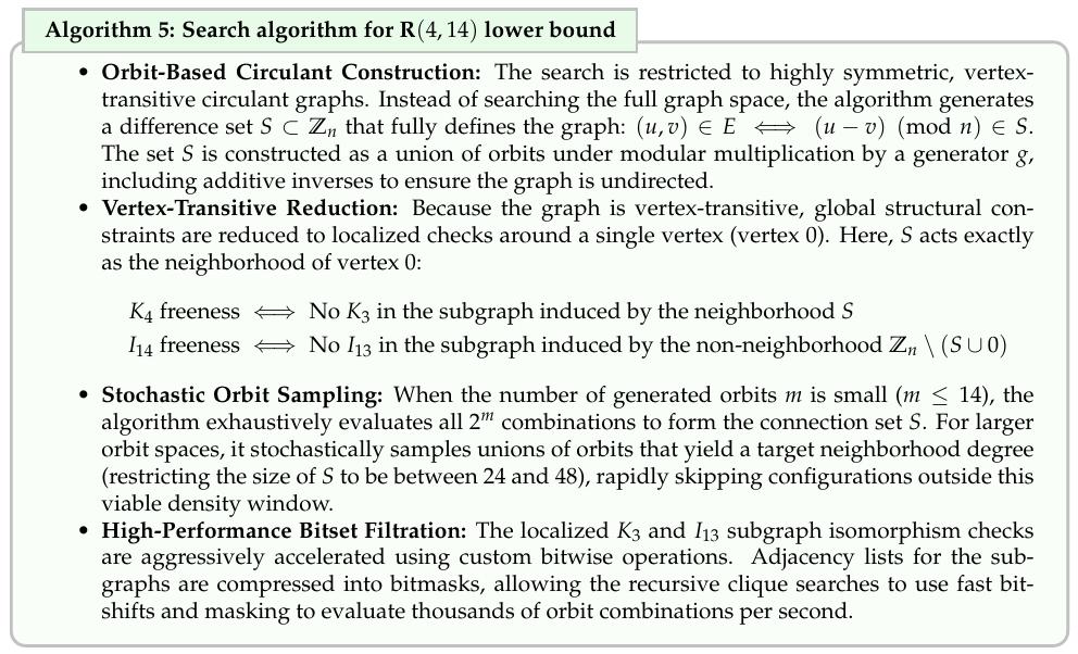 此前最佳纪录由Exoo和Tatarevic在2015年创造,他们的算法从三次剩余图出发,用标准模拟退火优化。