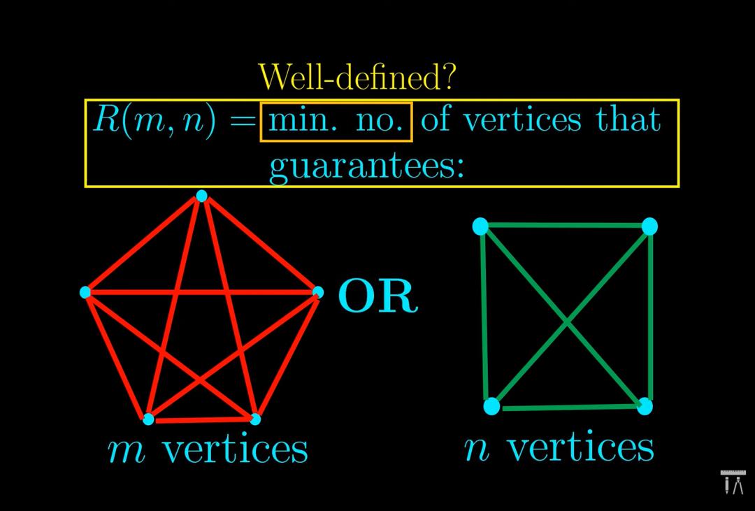 在图论中,R(r,s)定义为最小整数n,使得任何包含n个顶点的无向图必然满足以下至少一种情况: