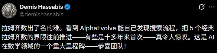DeepMind研究者报喜后,CEO Hassabis也火速转发庆贺。他表示,AlphaEvolve的这项成果,是AI在数学领域的又一个重大里程碑!