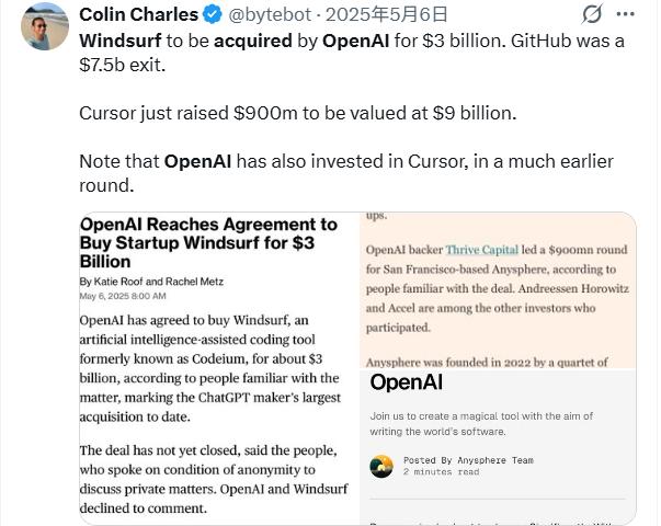 索蒂奥在3月组建了一个“冲刺团队”,把内部几个小组整合在一起,计划在几周内推出竞品。与此同时,奥特曼开始寻找收购目标,他们看上了一家叫Windsurf的AI编程初创公司,报价30亿美元。如果收购完成,产品、团队、企业客户都能快速补齐。