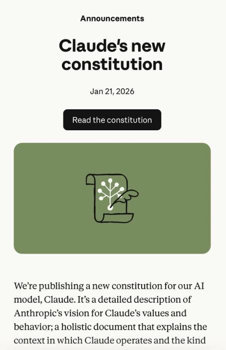 今年 1 月,Anthropic 发布了一份长达 80 页的文件,被称为 Claude 的「宪法」。媒体关注的是文件末尾关于 AI 意识的推测——当然,老板 Dario Amodei 也话里话外「暗示」这一点。