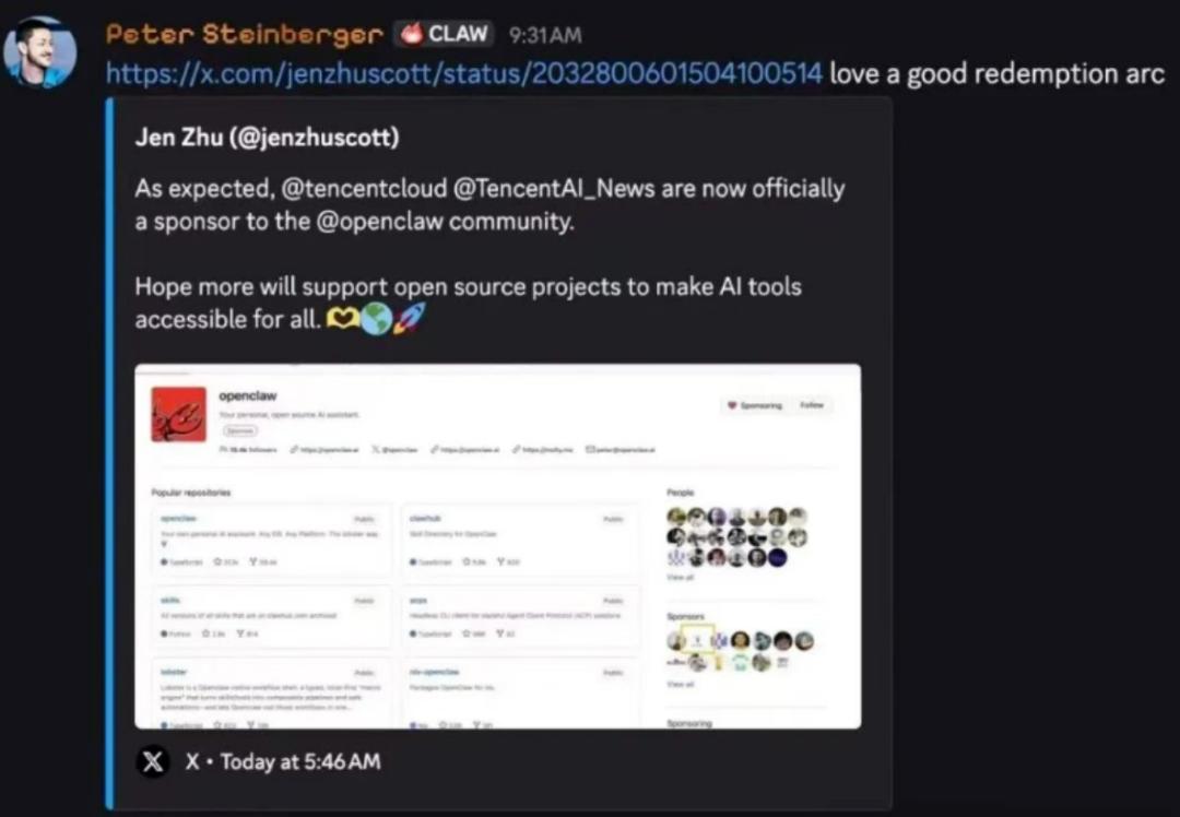 而OpenClaw创始人Peter Steinberger也转发了腾讯成为OpenClaw赞助商的博文,并表示“love a good redemption arc”。