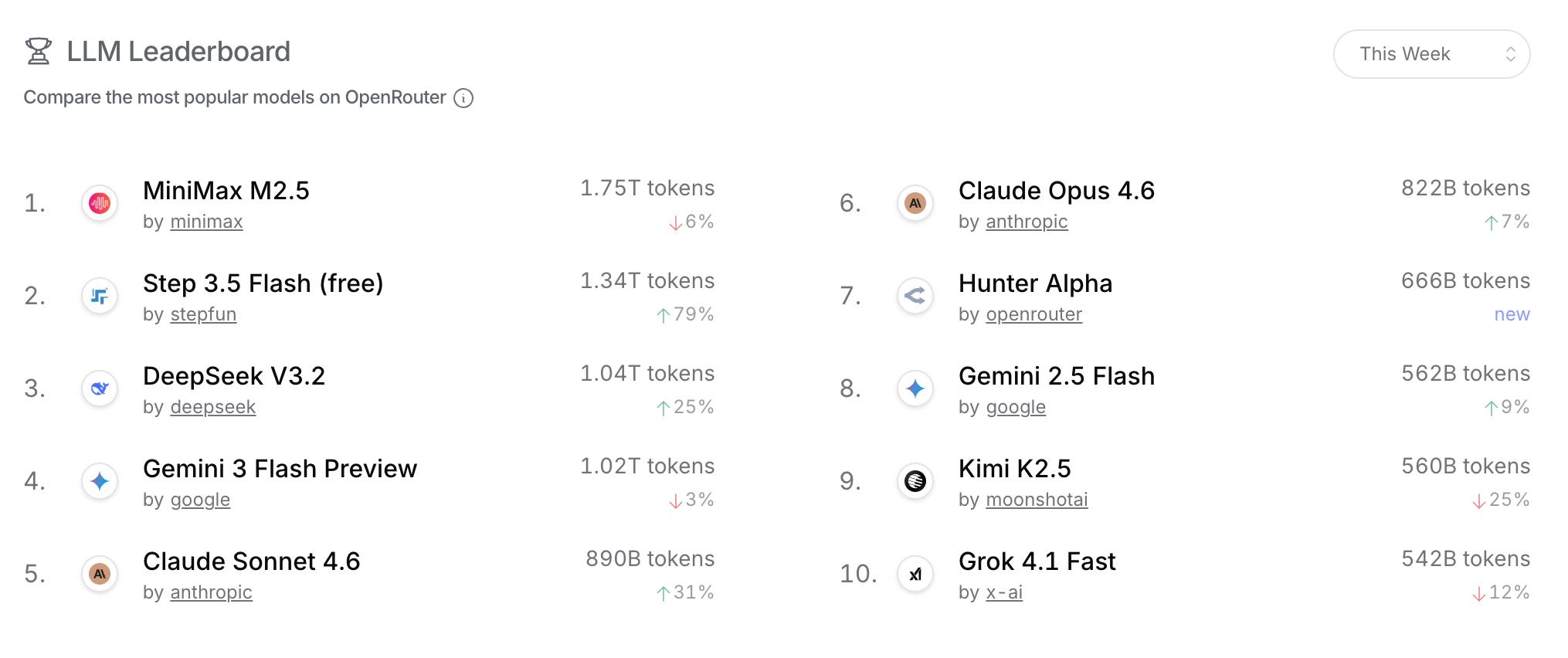 上周Token调用量前三的模型均为中国大模型,分别为MiniMax M2.5、阶跃星辰Step 3.5 Flash (free)和DeepSeek V3.2。其中,MiniMax M2.5周调用量达1.75万亿Token,虽环比下滑6%,但已经连续五周蝉联榜首;阶跃星辰Step 3.5 Flash (free)周调用量达1.34万亿Token,环比大幅增长79%;DeepSeek V3.2周调用量达1.04万亿Token,环比增长25%。