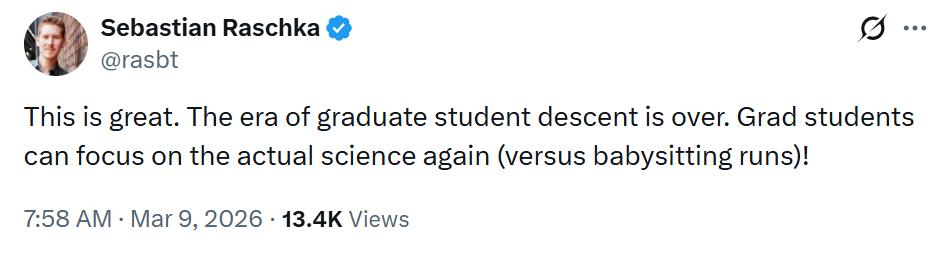 autoresearch 项目在社区内掀起不小的关注度,有 1060 万次围观。有网友评价道,“太好了,研究生终于可以专注于真正的科学研究,而不是像保姆一样看着机器运行!”