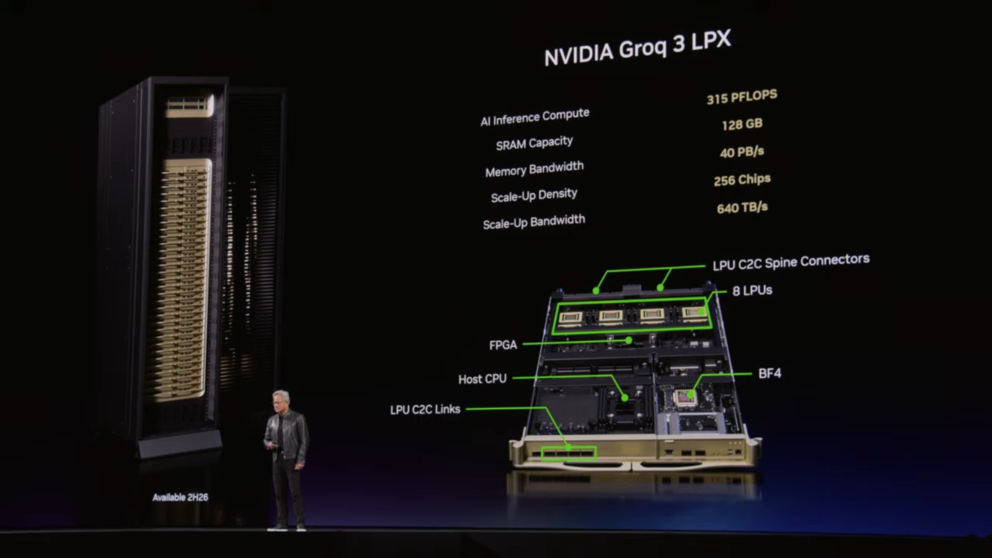 为应对智能体系统低延迟和长上下文的需求,英伟达推出了 Groq 3 LPX 推理加速机架。该系统包含 256 个 LPU 处理器,与 Vera Rubin 结合后,每兆瓦推理吞吐量飙升至最高 35 倍。