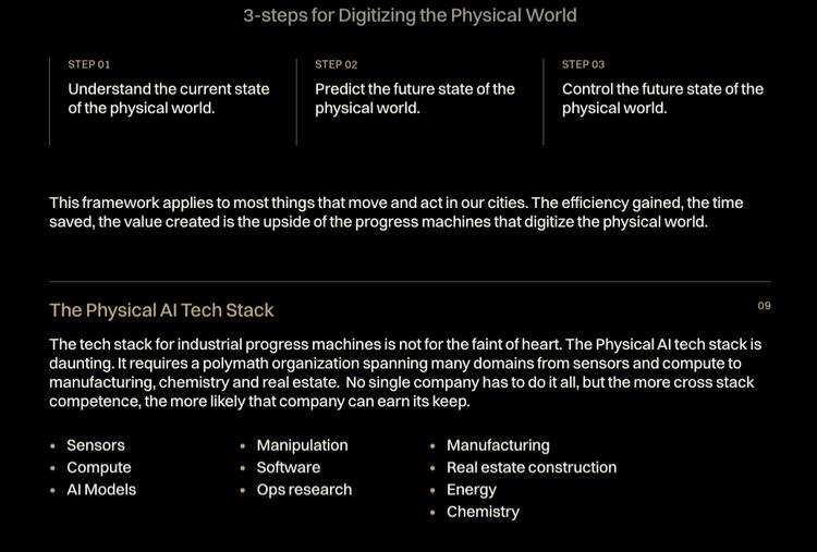 他在官网用 Uber 举例:Uber 司机的手机相当于城市里的传感器,可以实时感知路况、垃圾车位置、红绿灯节奏。掌握了这些数据,就能把乘客的等待时间缩短三分钟。这是数字化物理世界最早的雏形,Atoms 要把这个逻辑扩展到食品、矿山和运输。