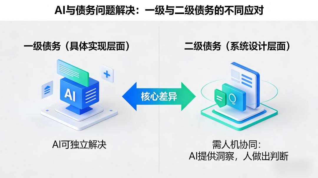 所以答案可能是:AI可以解决“一级债务”(具体实现层面的问题),但难以解决“二级债务”(系统设计层面的问题)。后者需要人机协同——AI提供洞察,人做出判断。