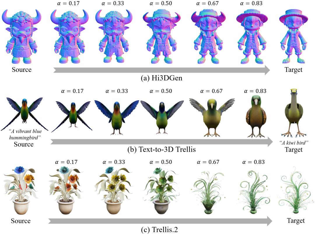 (1)结构-细节解耦三维变形(Decoupled 3D Morphing):如图7-(a) 所示,通过在Trellis的不同生成阶段有选择地应用上述组件,用户可以实现全局几何结构与局部表面细节的独立解耦控制,从而精准把控变形效果。