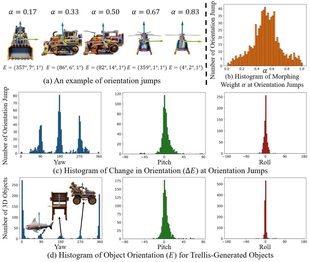 此时,源与目标图像条件处于「模棱两可」的过渡态(如图5-(b) 所示),生成模型容易受到干扰。此外朝向的强烈变化高度集中在偏航角(Yaw)的90°、180°、270°,而俯仰角(Pitch)和翻滚角(Roll)则基本保持稳定,如图5-(c) 所示。这表明朝向跳变并非随机噪声,而是源于系统性的偏差。作者推测其根源在于 Trellis 模型习得的生成姿态先验。