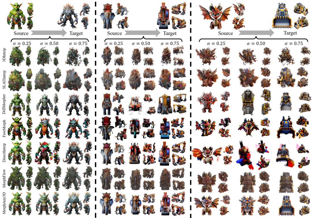 DirectInterp的特征融合方式并不适用于 SLAT,导致变形效果不佳。相比之下,MorphAny3D充分释放了SLAT中三维生成先验的潜能,产生了时序平滑、语义明确且视觉逼真的变形效果。