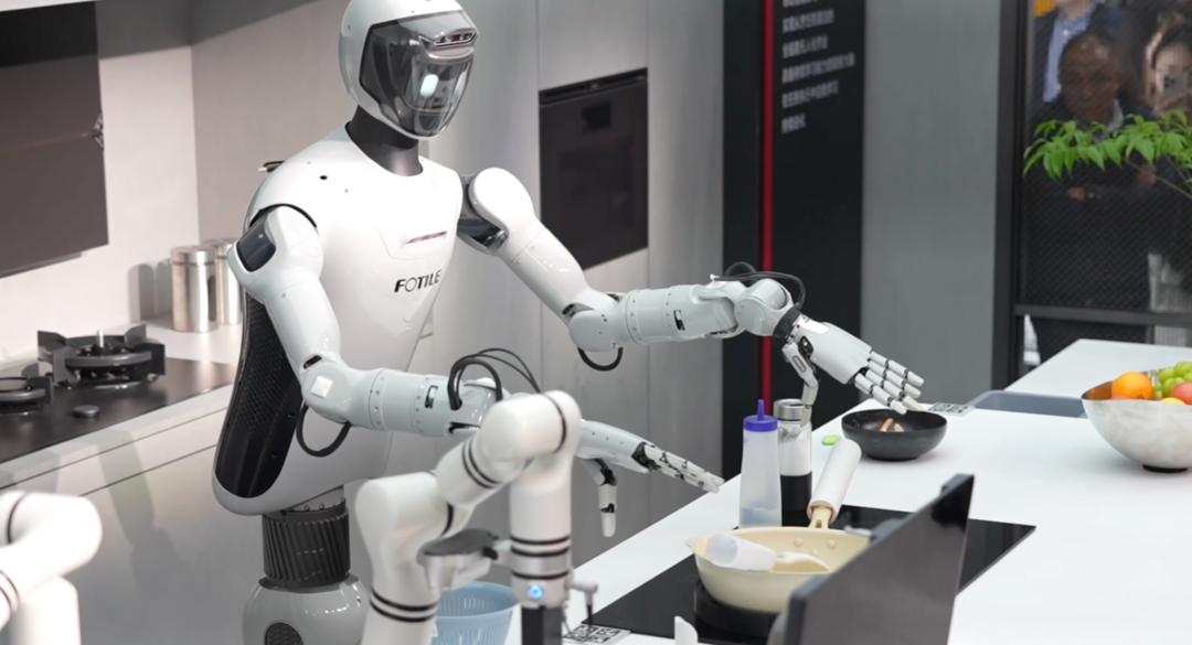 而在另一侧的展馆,一台机器人正在厨房里翻炒食材。机械臂抓起锅铲,在锅中翻动食材,动作并不算流畅,但已经足够完成一道简单的家常菜。