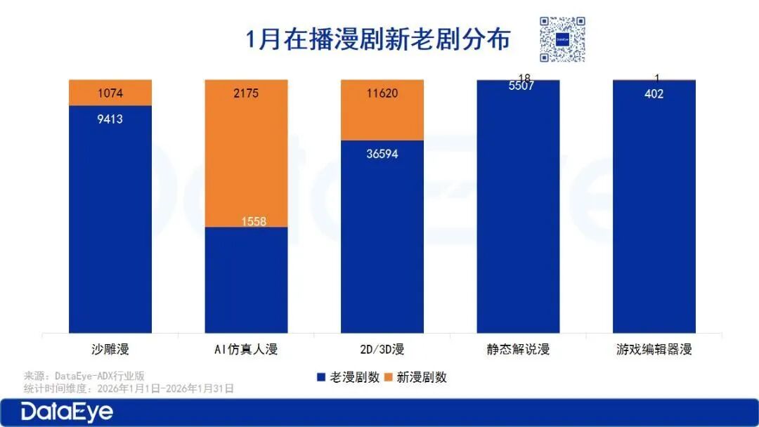 DataEye-ADX行业版数据显示,从2025年第四季度开始,漫剧的上线数量已经维持在每月1万部以上。而在2026年1月的漫剧百强榜中,飙升最快的来自于AI仿真人剧,百强榜占比迅速从去年的7%拉至38%,总计播放量达25.48亿。更直观的数据是,在漫剧上新这方面,今年前两个月,AI仿真人剧新剧占比分别达到58.26%、61.1%,是唯一新剧占比超过50%的类型,呈现出更强的创作活力。