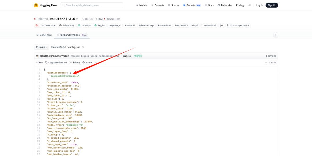 在知名的 AI 开源库 Hugging Face 上,Rukuten AI 3.0 赫然在自己的配置文件里面写着架构来自 DeepSeek V3。
