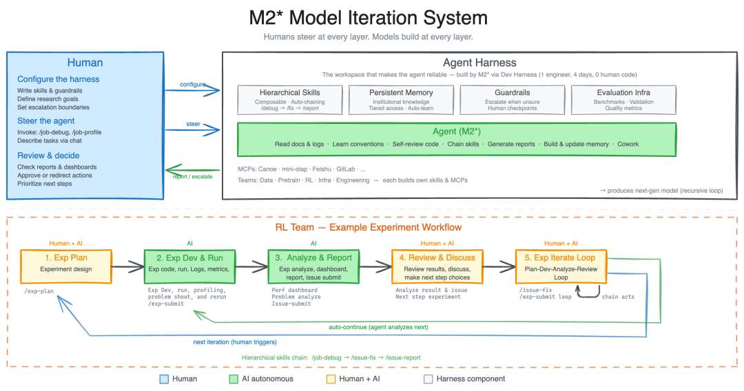 Agent Harness 通常依赖复杂的 Skills、记忆系统和其他组件来提升模型对不同工作环境的适应能力。在此基础上,我们在 M2 的早期版本中,将其引导为一个研究型 Agent 框架 —— 它能够与不同的研究项目组进行交互和协作。该系统覆盖了数据流水线、训练环境、评测基础设施、跨团队协作、持久化记忆 —— 让研究员可以驱动它来交付更好的模型。研究 Agent 驱动着产出下一代模型的迭代循环。研究员在每一层引导方向,模型在每一层负责构建。