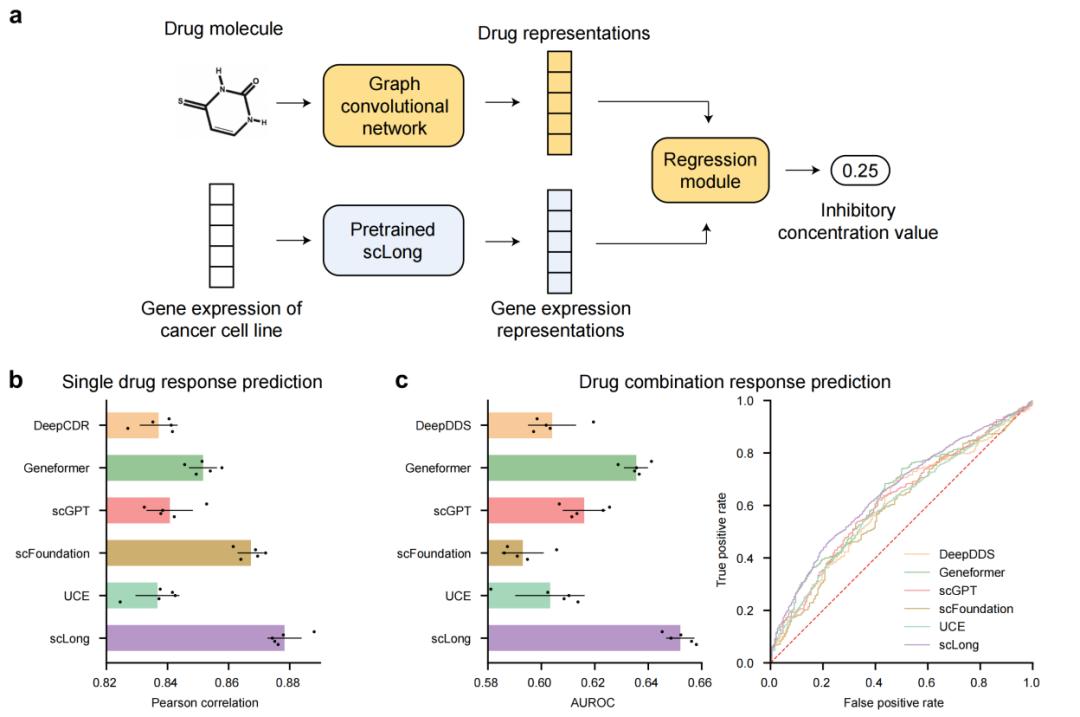在癌症药物反应预测任务中,模型需要根据药物结构和癌细胞表达谱,预测药物疗效。论文在DeepCDR数据集上报告,scLong的Pearson相关系数达到0.878,高于Geneformer 的0.852、scFoundation的0.867、DeepCDR的0.837以及线性模型的0.746