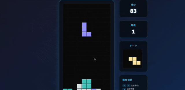 大概过了一分钟,一个内置「得分」「等级」「操作说明」的简易版俄罗斯方块小游戏就做好了~