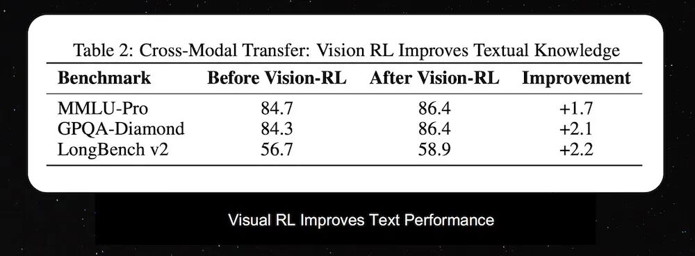 他提到,在原生视觉-文本联合预训练过程中,引入视觉强化学习(Vision RL)后,模型不仅在视觉任务上表现提升,也会反向提升纯文本能力。消融实验结果显示,在经过视觉RL训练后,模型在MMLU-Pro和GPQA-Diamond等文本基准上的表现提升约1.7%-2.2%。