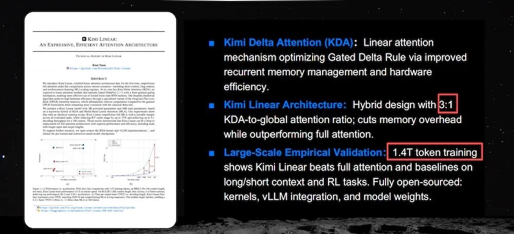 杨植麟在演讲中提到,Kimi Linear已经完成1.4T token规模训练,在长上下文、短上下文以及强化学习任务中均优于全注意力及其他基线方案。