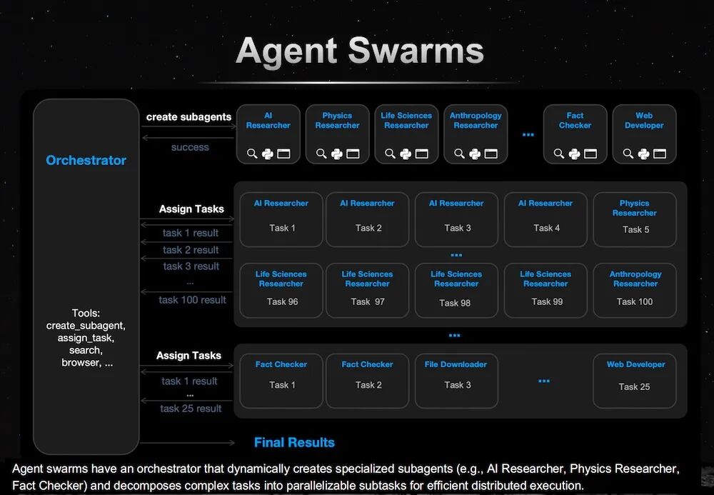 他在演讲中提到,未来的智能体形态将从单智能体,转向可以动态生成的集群系统。Kimi K2.5引入Orchestrator(编排器),能够根据任务需求创建多个子Agent,并将复杂任务拆解为并行子任务执行。