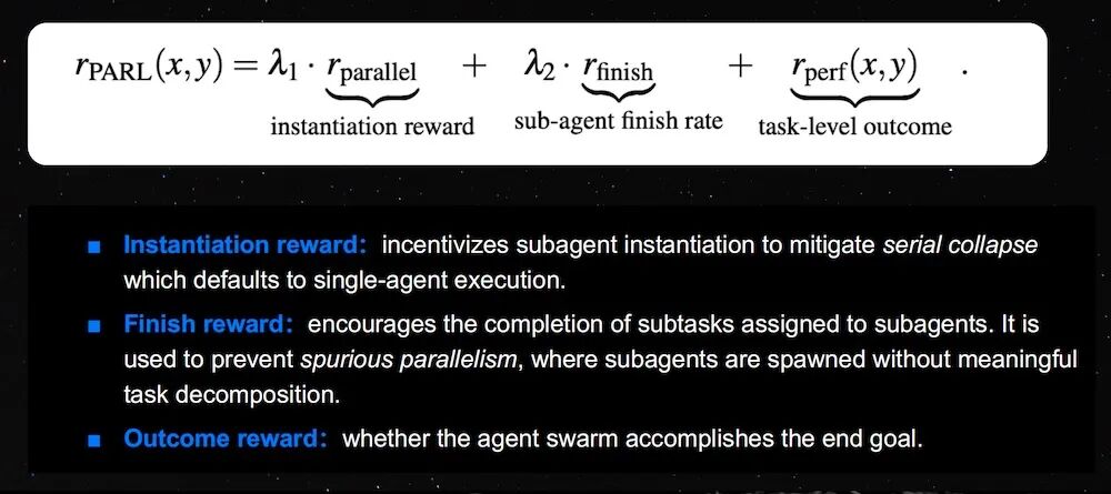 他同时指出,多Agent系统容易出现“串行塌缩”,即表面多Agent,实际退回单Agent执行。为此,Kimi设计了并行强化学习奖励机制,包括Instantiation reward(实例化奖励)、Finish reward(完成奖励)和Outcome reward(结果奖励),用于引导模型真正进行任务拆解和并行执行。