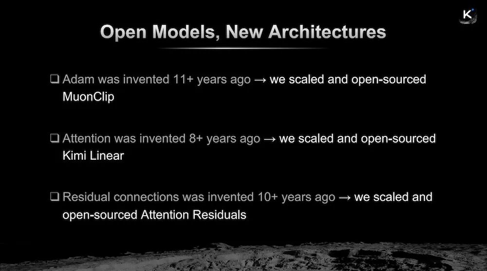 这也成为Kimi当前路径的基础:Adam诞生已超过11年,Kimi将其推进为MuonClip并开源;Attention提出已超过8年,Kimi发展出Kimi Linear并开源;Residual connections已有约10年历史,Kimi进一步提出Attention Residuals并开源。