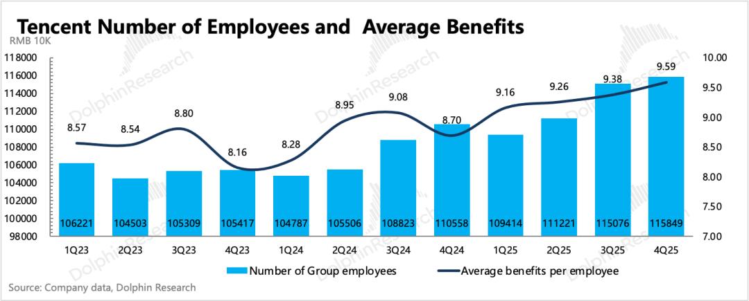 未来短中期的利润率变动可能会受到持续的投入所影响,虽然苹果税调整有利于腾讯增值服务毛利率的改善,但AI投入也会逐步体现到折旧成本、算力租赁费用上,以及短期可能也会有研发人员成本增加(公司上季度表态AI提效不倾向裁员而是做业务创收的增加,因此预计不会出现短期大力度裁员而是控制人员增量,Q4员工净增773人相比上季度就有明显减少),中长期才可能会因为整体经营效率提升而对利润率起到正面推动。