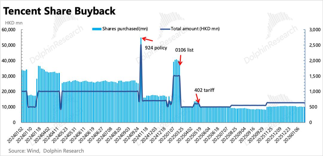 公司自身回购上,四季度回购近200亿港元,环比小幅下降。从日均回购规模来看,上季度财报发布之后恢复回购此次静默期之前,每日回购金额提高至6.35亿HKD左右,要比之前的5.5亿明显多了一些。