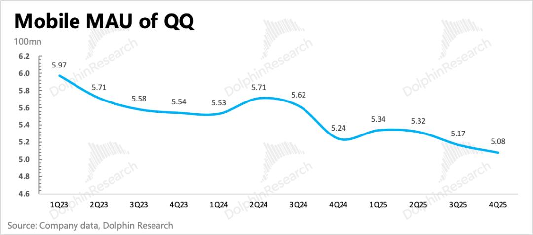 四季度微信用户14.18亿,环比净增400万,稳定扩张但节奏放缓。QQ没啥好说的,继续下滑。