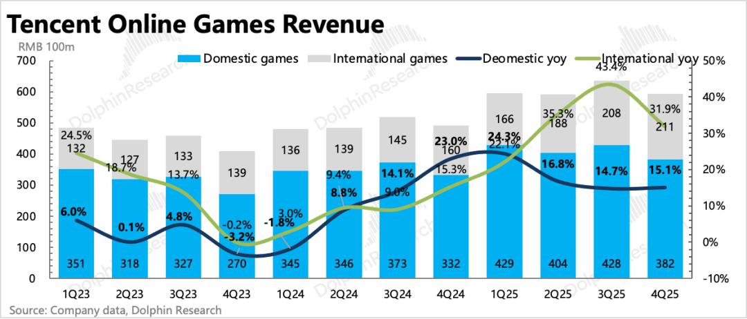 四季度网络游戏收入593亿,同比增长21%,其中国内增长15%,海外增长32%(汇率顺风大约1pct)。