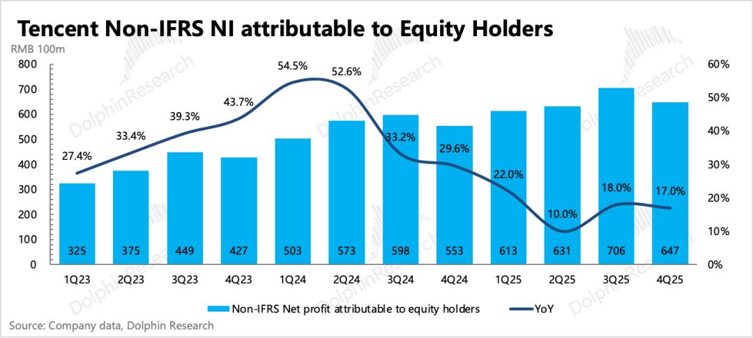 4. 成本优化,费用增加:最终利润率提升趋势不变,经营利润率同比提高2pct。但当季在元宝等AI产品上的宣发开支体现得比较明显,单看推广费用同比增长44%,环比多花了15亿。除了少量新游戏宣发外,应该就是主要用于元宝买量了,显然Q1销售费用只会更高。
