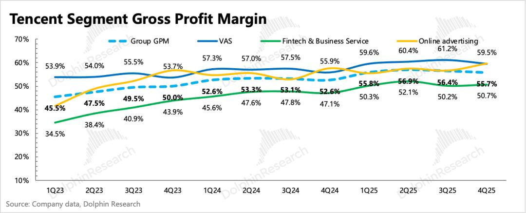 其他支出增长较多的,主要还是和AI相关的服务器费用以及研发人员成本。整体经营费用率同比继续提升0.5pct,但被毛利率改善对冲了。三大业务毛利率均有不同程度的提高,背后原因包括自研游戏占比增加(减少分成)、视频号广告占比提高等因素推动。