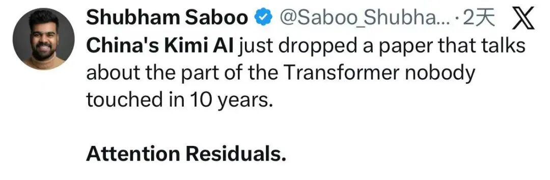 本周,一篇题为《Attention Residuals》的论文,将Kimi推至全球人工智能领域的聚光灯下。论文作者之一,甚至是一名年仅十七岁的高中生。xAI首席执行官埃隆·马斯克与Google高级人工智能产品经理Shubham Saboo,亦公开发文祝贺。后者更宣称,Kimi正在触及Transformer架构中“长达十年无人触碰的部分”。