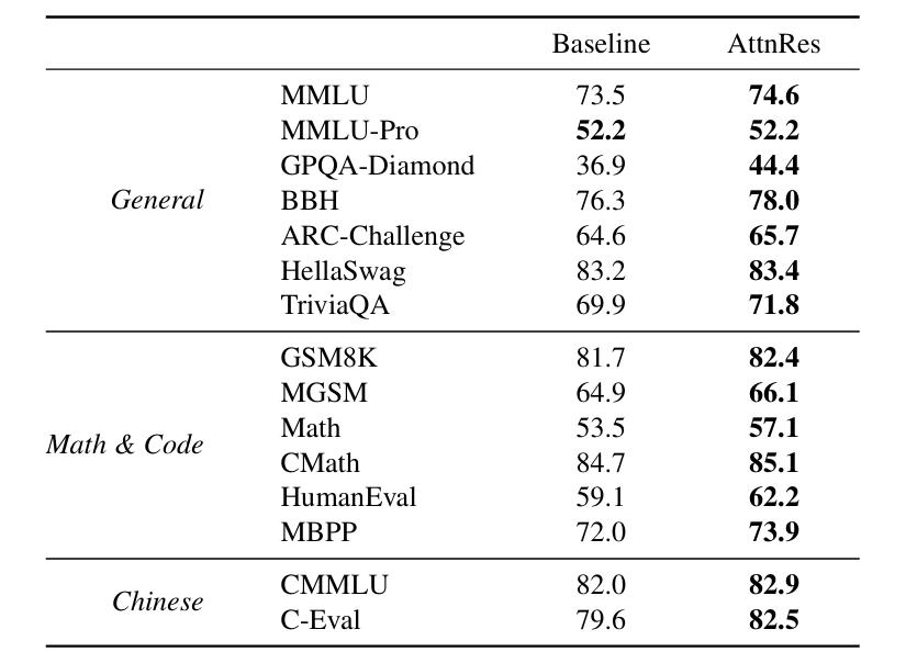 GPQA-Diamond提升7.5%,Math提升3.6%,HumanEval提升3.1%。这一结果在逻辑上高度自洽:数学推导与代码生成皆要求模型具备长时间推理与信息保持能力,AttnRes的深度检索机制恰好契合了这种“不忘初衷”的内在需求。