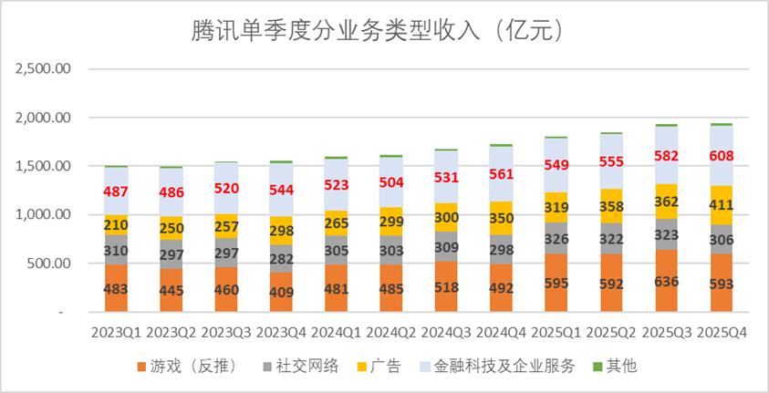 2025年第四季度,腾讯游戏业务营收(增值服务反推)593亿元,同比增长20.5%,与2024年同期增速基本持平,但是相较于前三季度增速略低,并且环比下降了6.8%。当然,这也比较符合市场预期,毕竟腾讯历年四季度游戏业务营收都低于三季度。