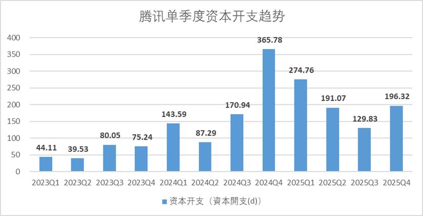 2025年四季度,腾讯录得资本支出196.3亿元,虽然仅有2024年同期的一半左右,但是环比2025年第二、第三季度还是有所提升,并且从现金流量来看,实际资本支出达到了224亿(包含预付款未确认)。