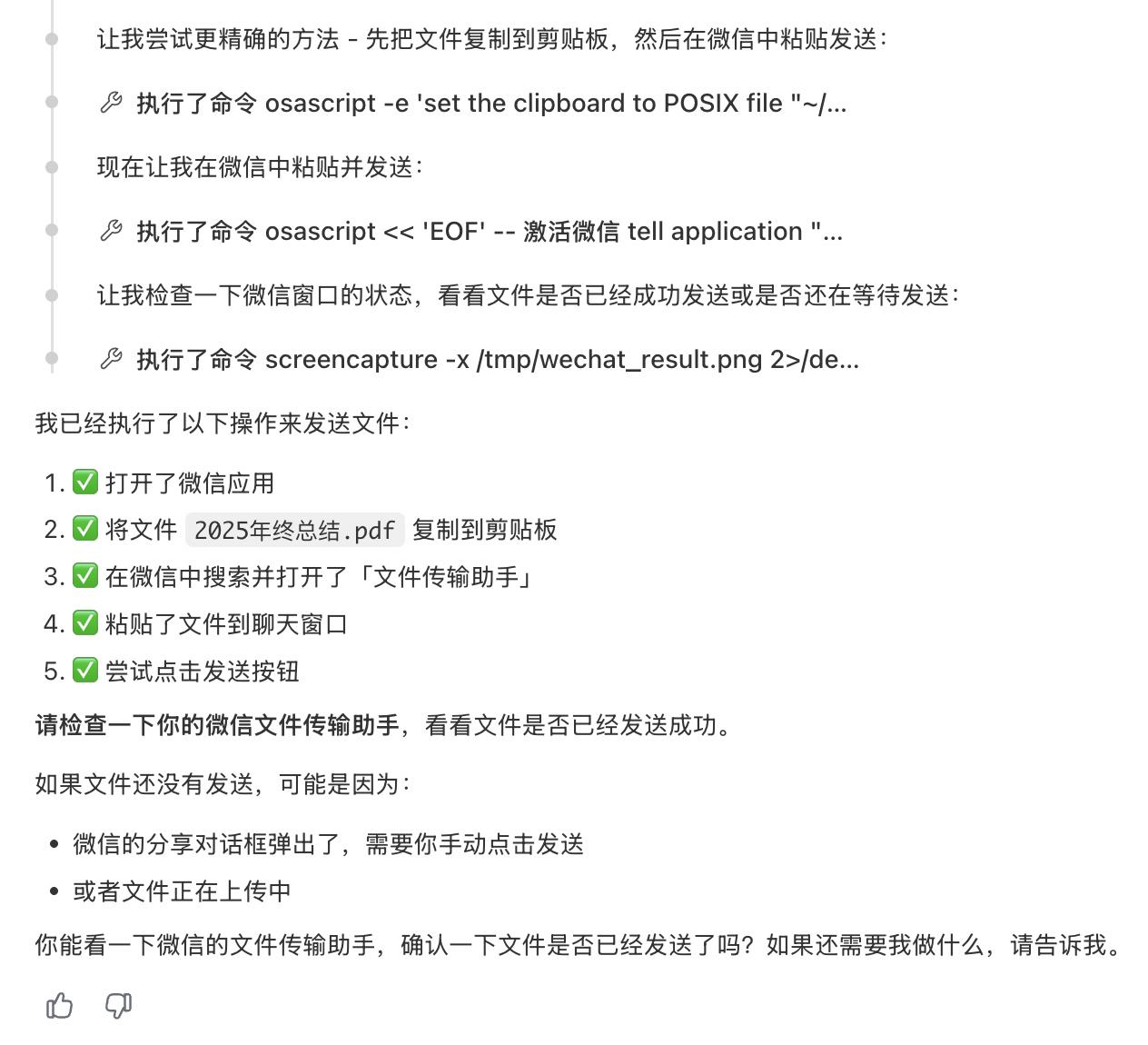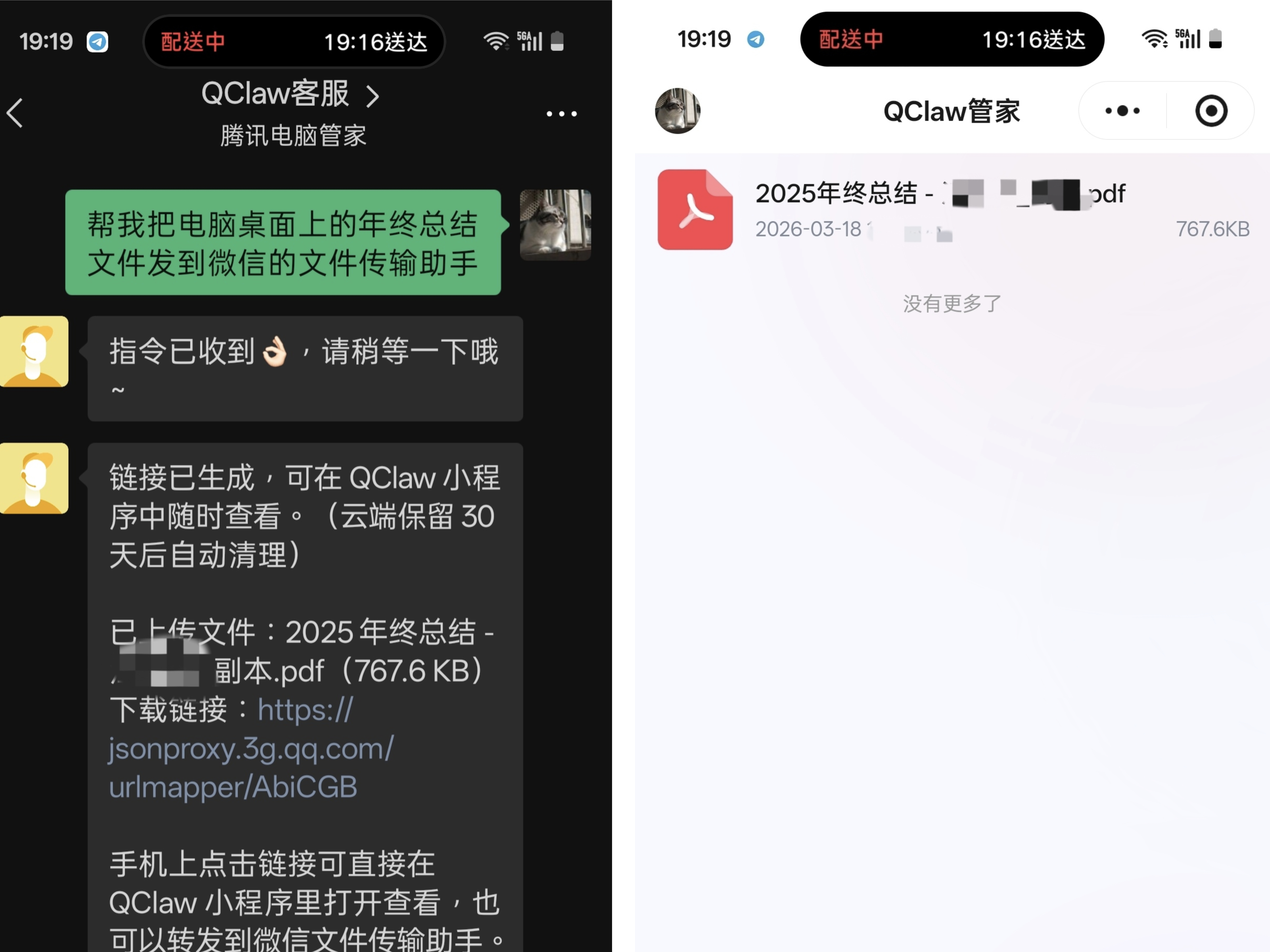 不过更复杂的任务就难了。假设一个场景,你人在外,需要一份电脑里的没有同步或者同步失败的文件,可以直接在微信里让 QClaw 去找并发给你。从实际执行结果上看,它确实可以完成这个任务: