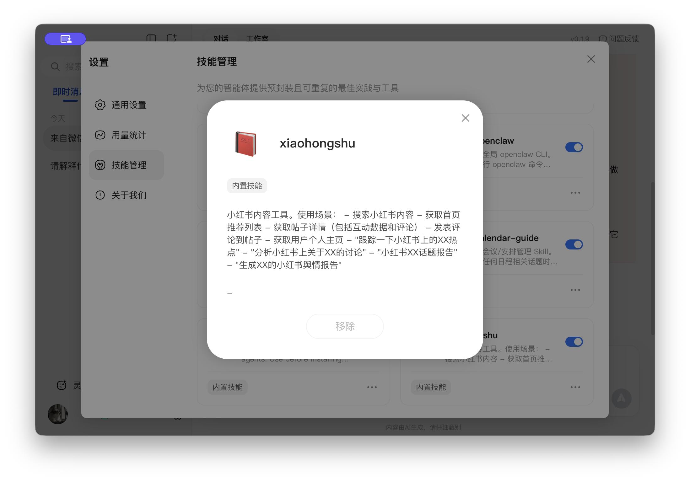 但另一个「小红书」的任务测试则暴露了 QClaw 在产品上的不完善。这里需要先提一下,QClaw 默认就配置了一系列 Skill,其中包括 QClaw 团队自己造的 Skill,也包括第三方的 Skill,其中就包括小红书的 Skill,简介指出可以「跟踪小红书 XX 热点」「分你小红书关于 XX 的讨论」等。